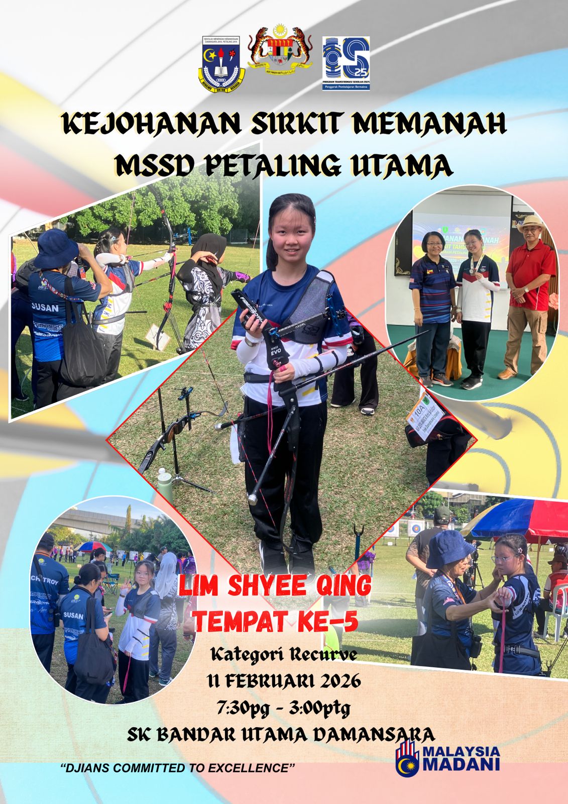Tahniah.Peserta tunggal dari SMKDJ mendapat tempat ke 5 kategori recurve sirkit memanah.
